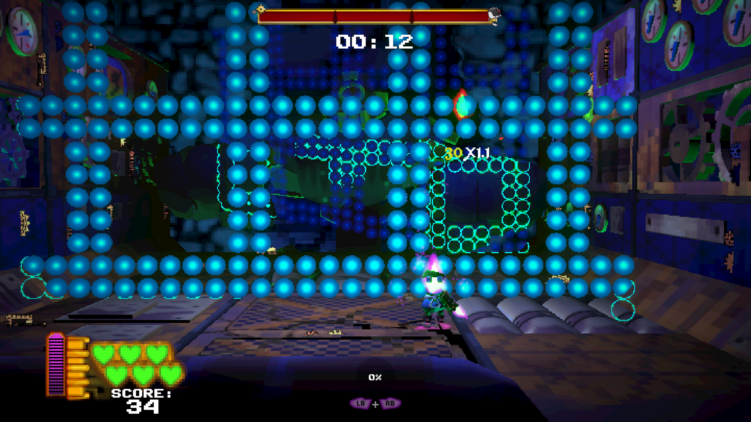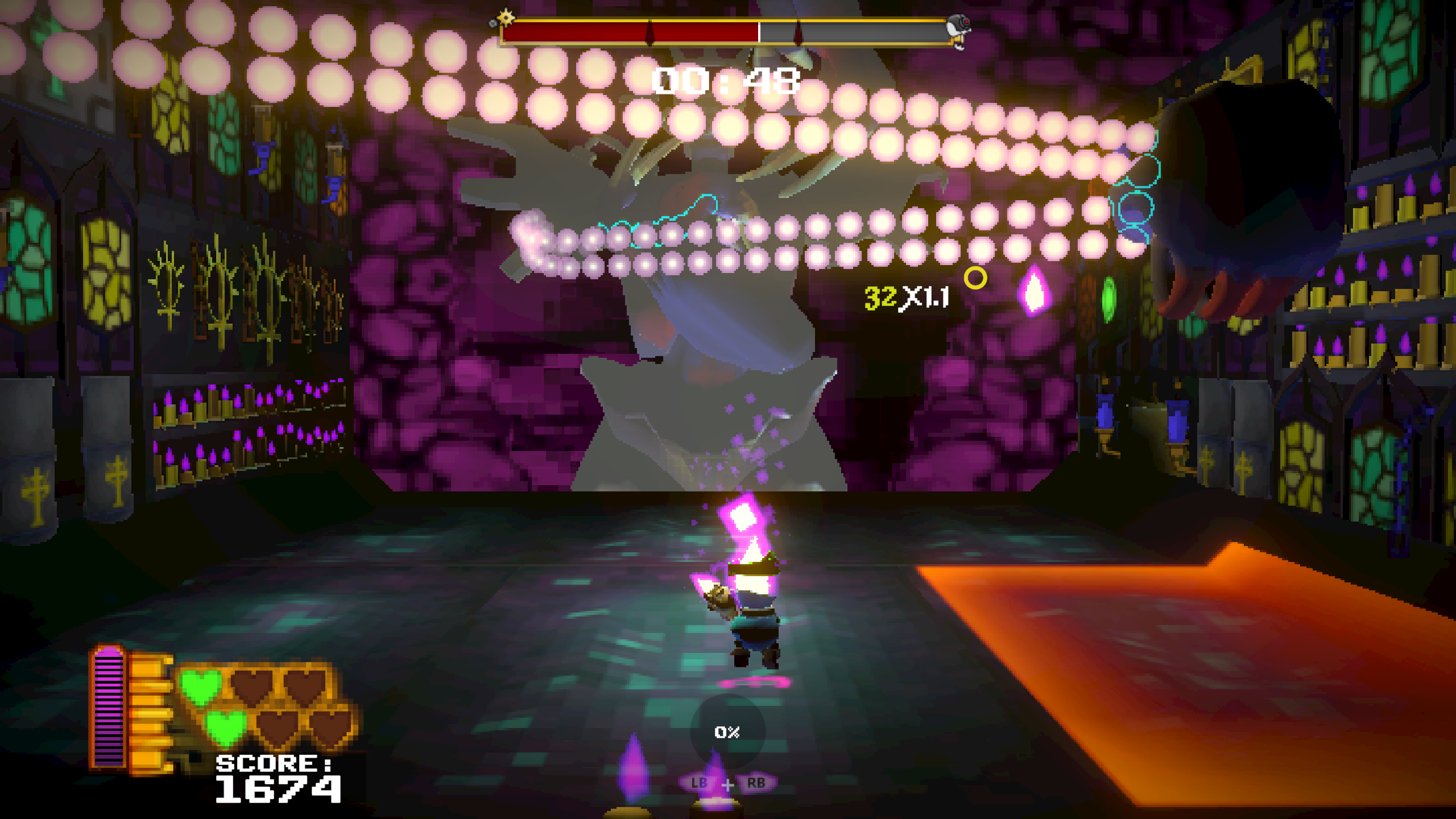 After some early playtests, we found that players wished to have a way to clear the created objects from the stage. So what if, instead of having two different mechanics, we combine them? Thus came to life the ultimate attack, where the player can choose to throw all of the crates on the stage towards the boss, dealing damage based off the size and quantity of items thrown. And what better way to combine this again with other mechanics, by having the resource to use that ultimate be linked to the gravity and bullet hell mechanics?