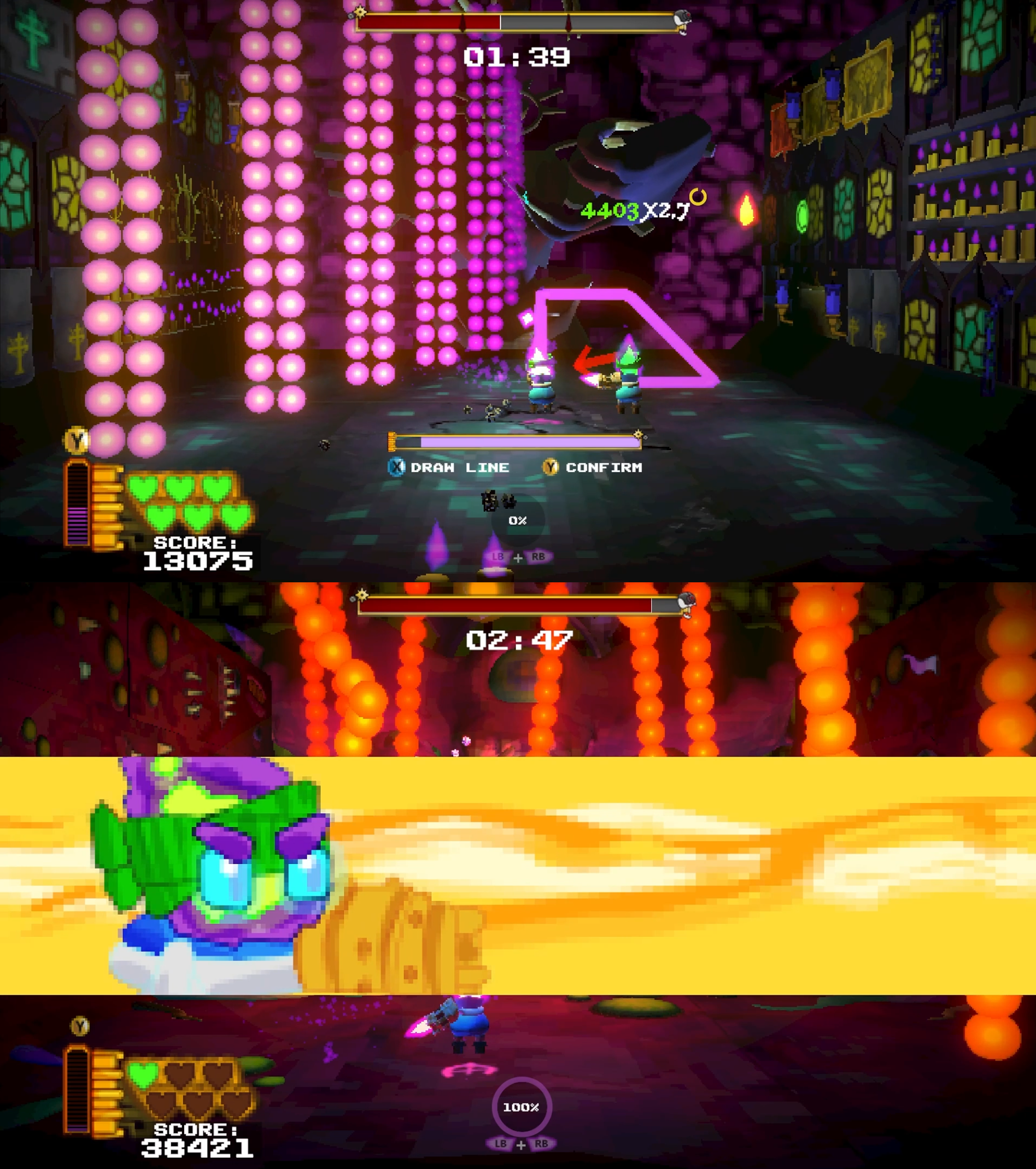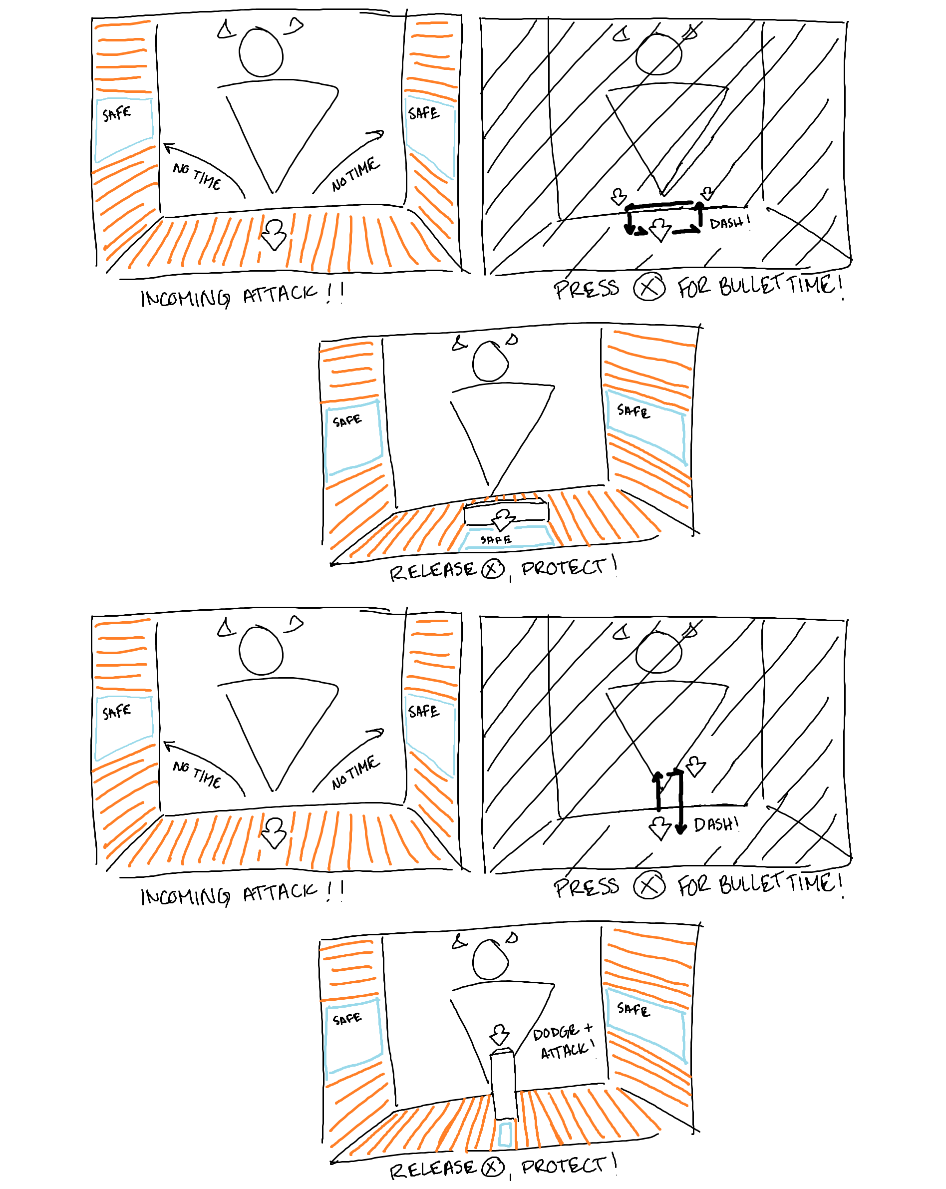 One of the prime examples of this is the ultimate attack. In the original design, the creation mechanic was always meant to have more of a defensive style, but it also had a way to deal damage to the boss. By creating a diamond shape, the player could spawn a bomb to attack the boss, in the event the player did not feel the need to use the drawing defensively. This, however, felt very cheap and players would not know how to make the bomb unless explicitly told.